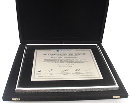 Placa de homenagem em aço inox e impressão colorida com moldura em veludo e alumínio em estojo de veludo.