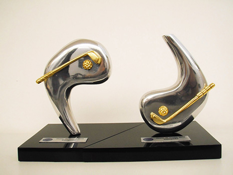 Alumínio fundido com detalhes em dourado, base em acrílico.