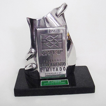 Troféu CPEVAT em fundição de alumínio, com logo em alto relevo e base em granito.