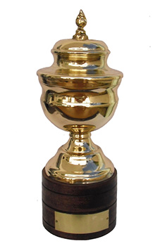 Taça em chapa de latão com base de madeira.