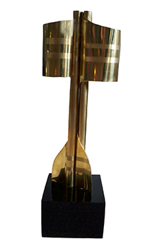 Taça em metal dourado e base em madeira.