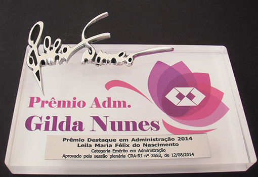 Troféu em placa de acrílico com impressão colorida e detalhe em fundição de alumínio.