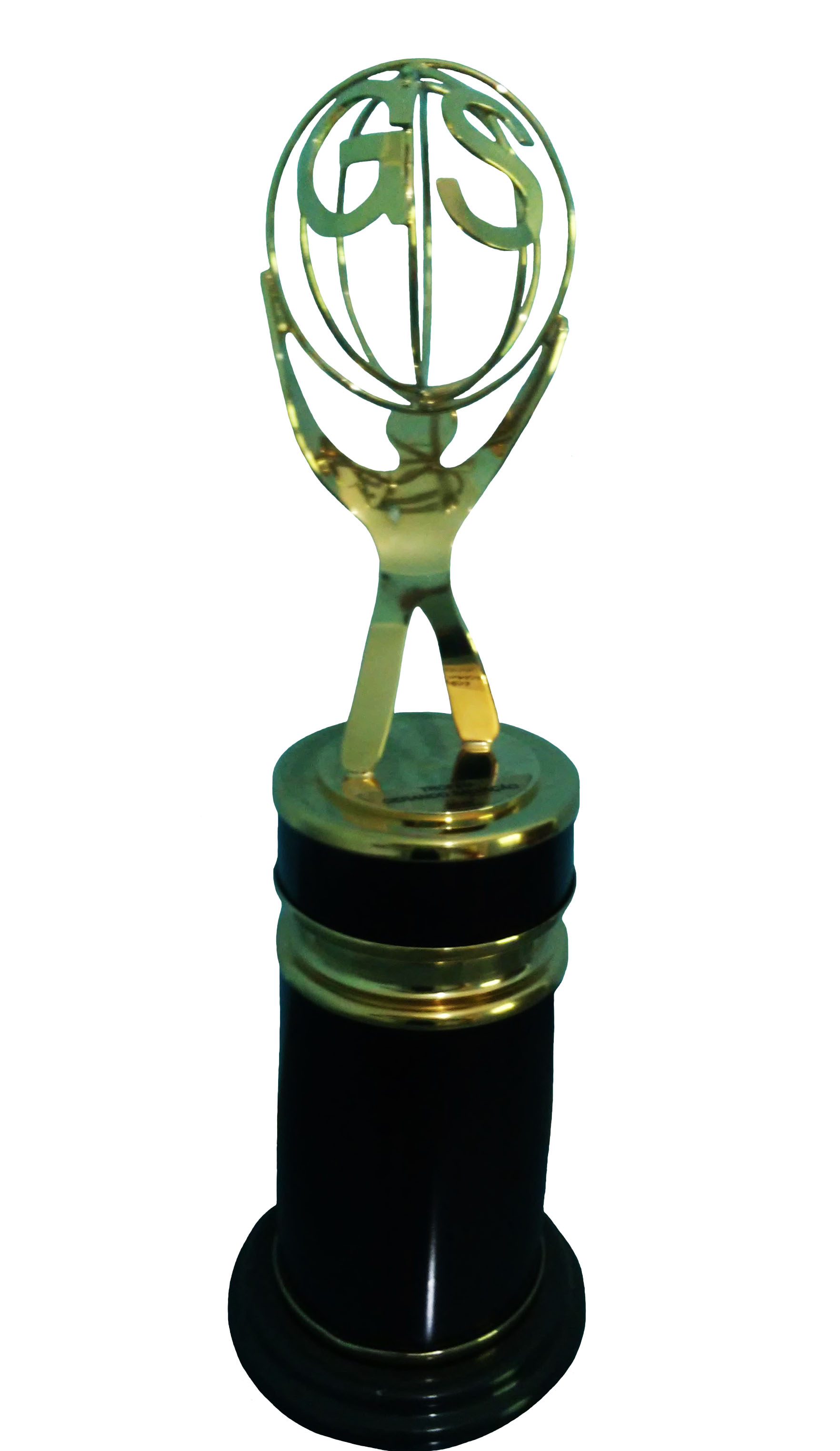 Troféu em metal com base em metal pintado.
