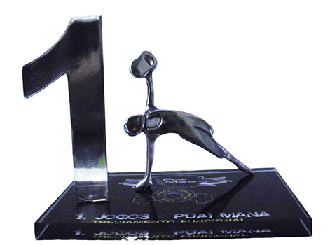 Troféu em fundição de alumínio com base em acrílico com impressão.
