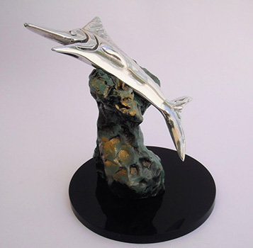 Troféu em fundição de alumínio com base em resina fundida e acrílico.
