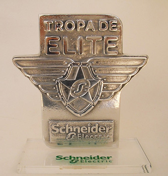 Troféu em fundição de metal com detalhes em alto relevo com base em acrílico.
