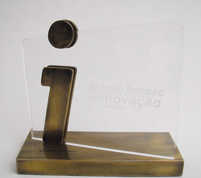Troféu em fundição de metal com placa em acrílico com impressão.