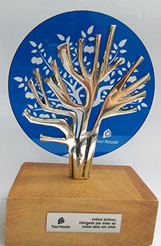 Troféu em fundição de metal prateado com acrílico, impressão e base de madeira.