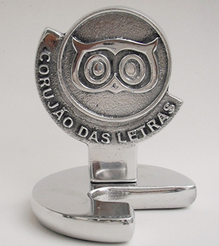 Troféu em fundição de metal prateado com detalhe em alto relevo.