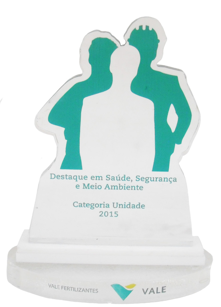Troféu em acrílico recortado com impressão colorida.