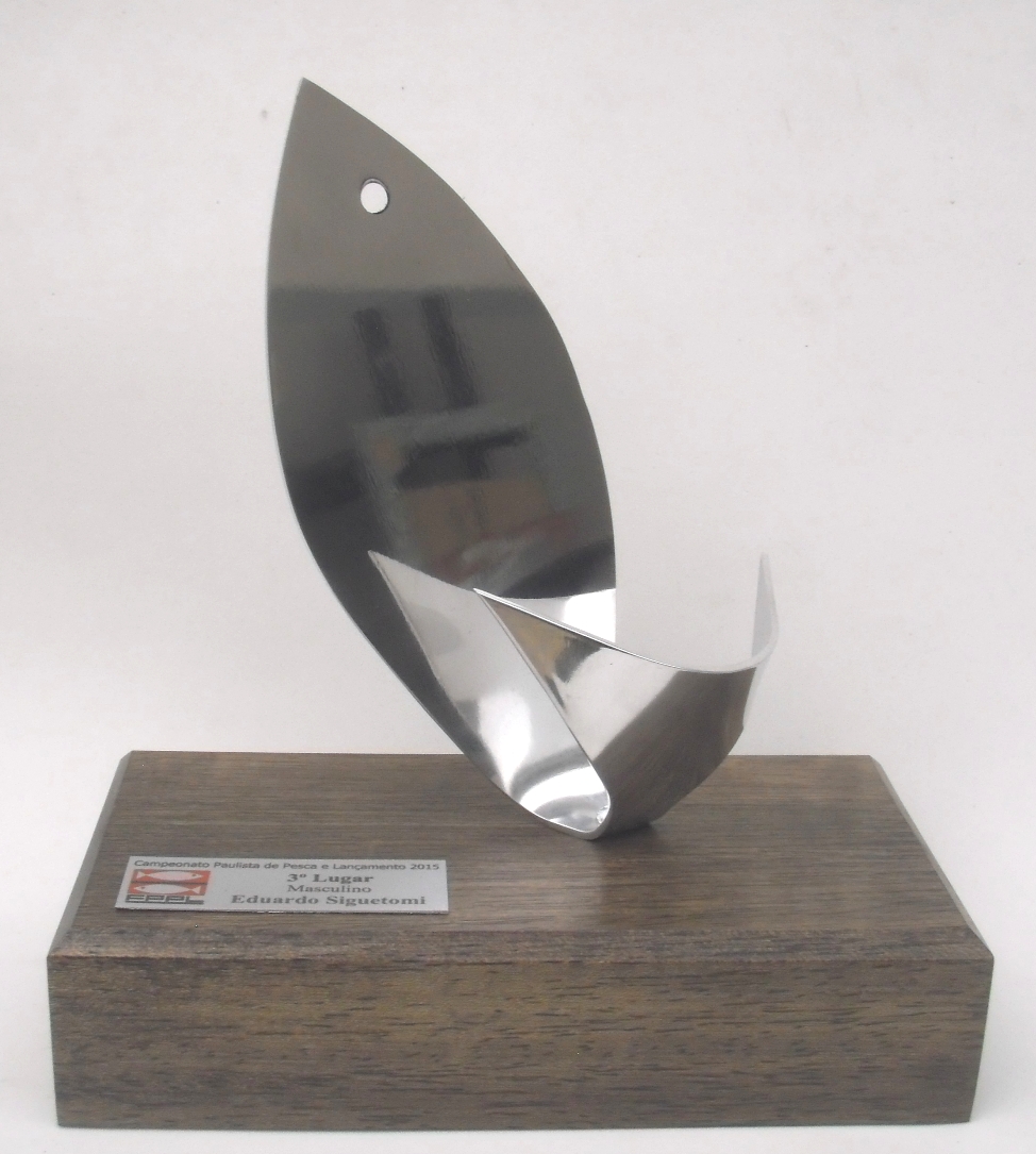 Troféu em chapa de aluminio recortado, base de madeira e plaqueta de premiação.