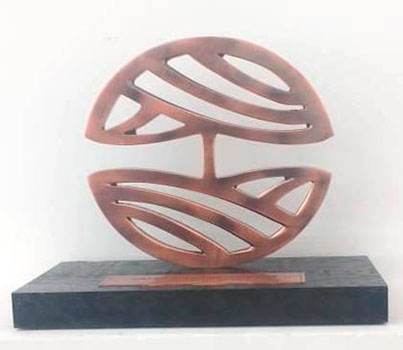 Troféu em fundição de metal com base em madeira pintada e plaqueta de premiação.