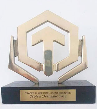 Troféu em metal com base de madeira e plaqueta de premiação.