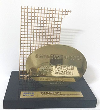 Troféu em metal dourado com base de acrílico preto e plaqueta de premiação.