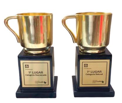 Troféu em metal dourado com base de madeira pintada e plaqueta de premiação.