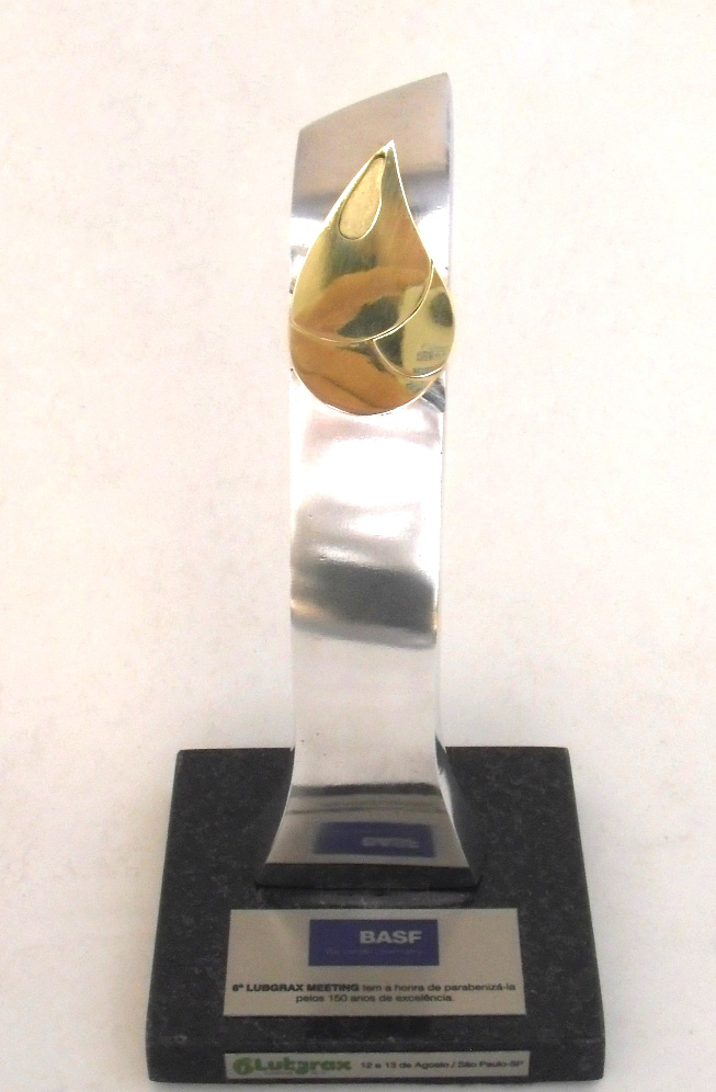 Troféu em fundição de alumínio, com detalhe em metal dourado e base de granito.